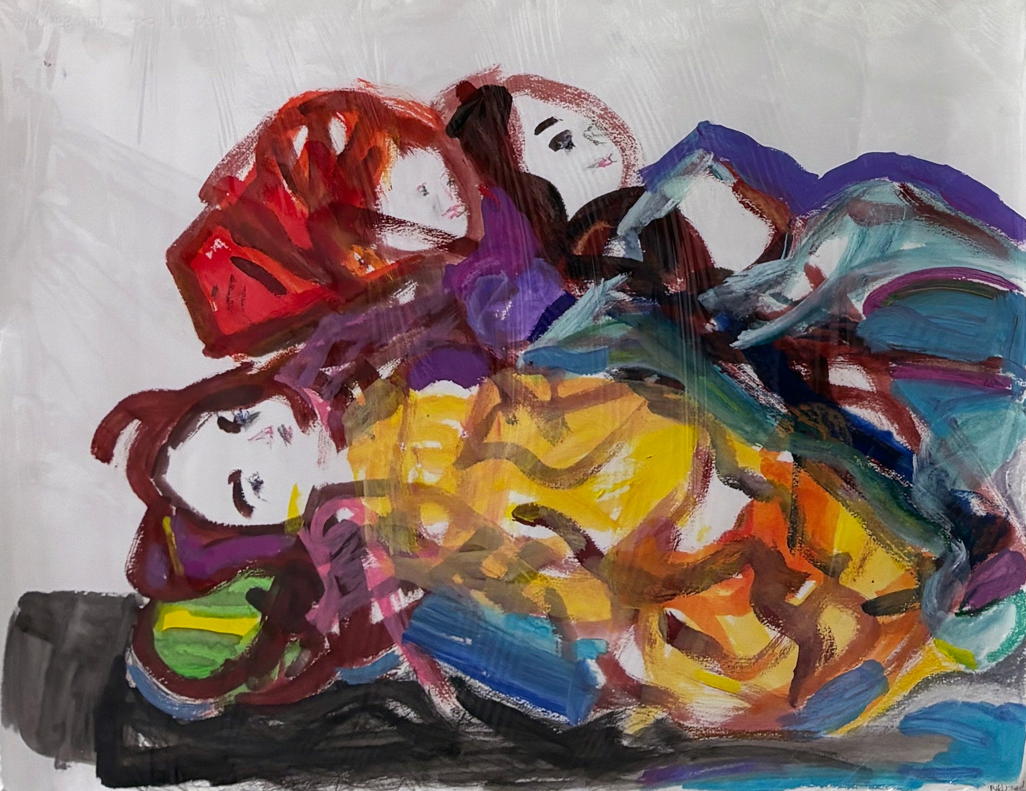 An original painting of 3 Disney princess dolls piled up together painted by artist Rachael Grad. The unique artwork features abstract marks and was painted using acrylic paint on premium 22" x 30" (55.28 cm x 76.2 cm) gessoed Arches paper. My goal with this piece was to capture the essence of three stuffed princess toys using careful layers of blue, pink, green, yellow, blue, and grey paint colours.